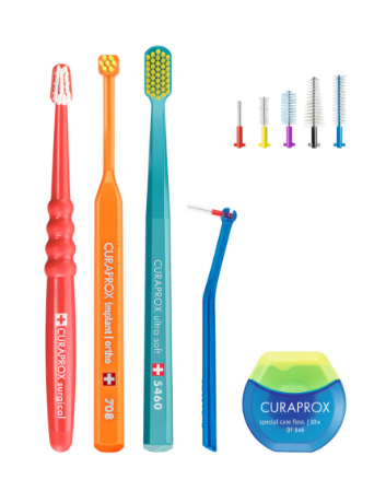 The gums are very sensitive after a dental surgery. Curaprox has the right tools to help keeping your teeth and implants clean and healthy, and assist your gums to recover. To make sure you are satisfied with your implant for a long time, we recommend this Implant kit. It is important that you can arrange your oral hygiene in a way that it is appropriate for your new implant.
